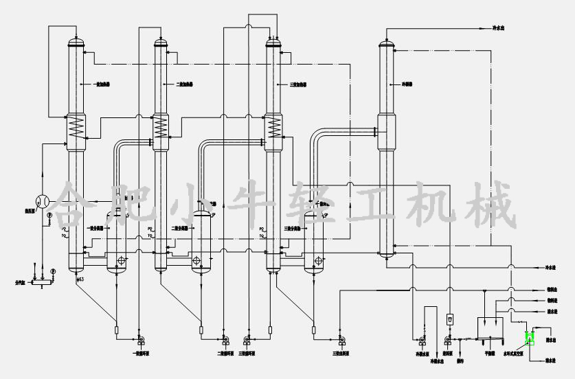 三效降膜蒸發(fā)器成套系統(tǒng)主要包括各效加熱器、各效蒸發(fā)分離器、預(yù)熱器、冷凝器、凝水罐、各物料泵、冷凝水泵、真空泵、設(shè)備平臺(tái)、電控系統(tǒng)、管路系統(tǒng)等部件。