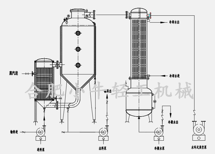 單效外循環(huán)蒸發(fā)器(單效濃縮器)在工作時,濃度較低的稀料液由進料泵或利用真空自吸的方法進入加熱器的管程,鍋爐高溫蒸汽進入加熱器的殼程,蒸汽對管程內的料液間接性加熱,料液受熱后沸騰,液面上升,從噴射管噴入分離器,進行閃蒸,在分離器內,比重較重的料液下降至底部,經(jīng)循環(huán)管回到加熱器再次受熱,受熱后再次沸騰噴入分離器,以此形成循環(huán),而比重較輕的二次蒸汽上升至頂部,經(jīng)二次蒸汽管路進入列管式冷凝器殼程,被冷凝器管程內的冷卻水冷凝成液相后進入冷凝水收集罐,最后由泵排出,以便回收利用或另行處理,一部分不凝氣體由真空泵抽走排出,當料液濃縮到一定的程度,經(jīng)取樣確定合格后即可出料,至此完成蒸發(fā)濃縮的過程。